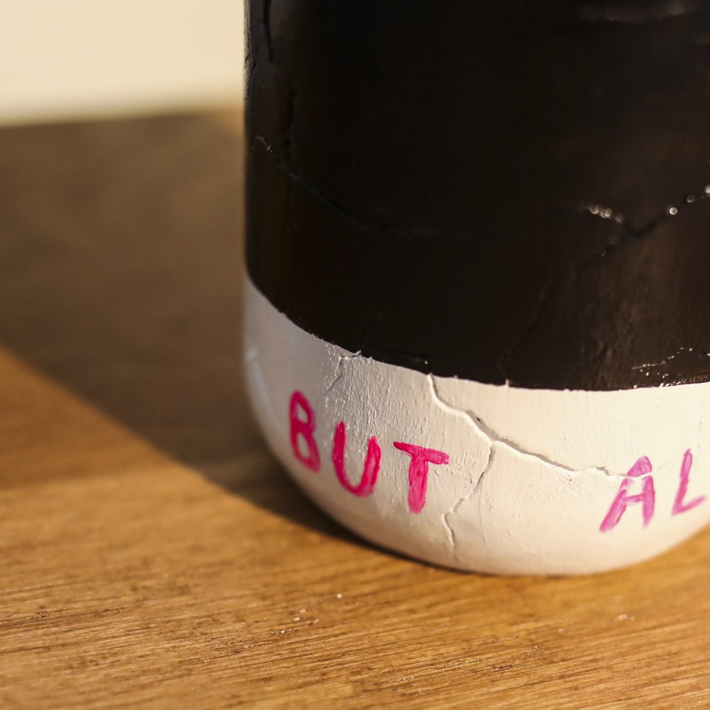 Les mots “alive but broken but” y figurent et forment une phrase que l’on peut lire de plusieurs façons, selon votre vision des choses.